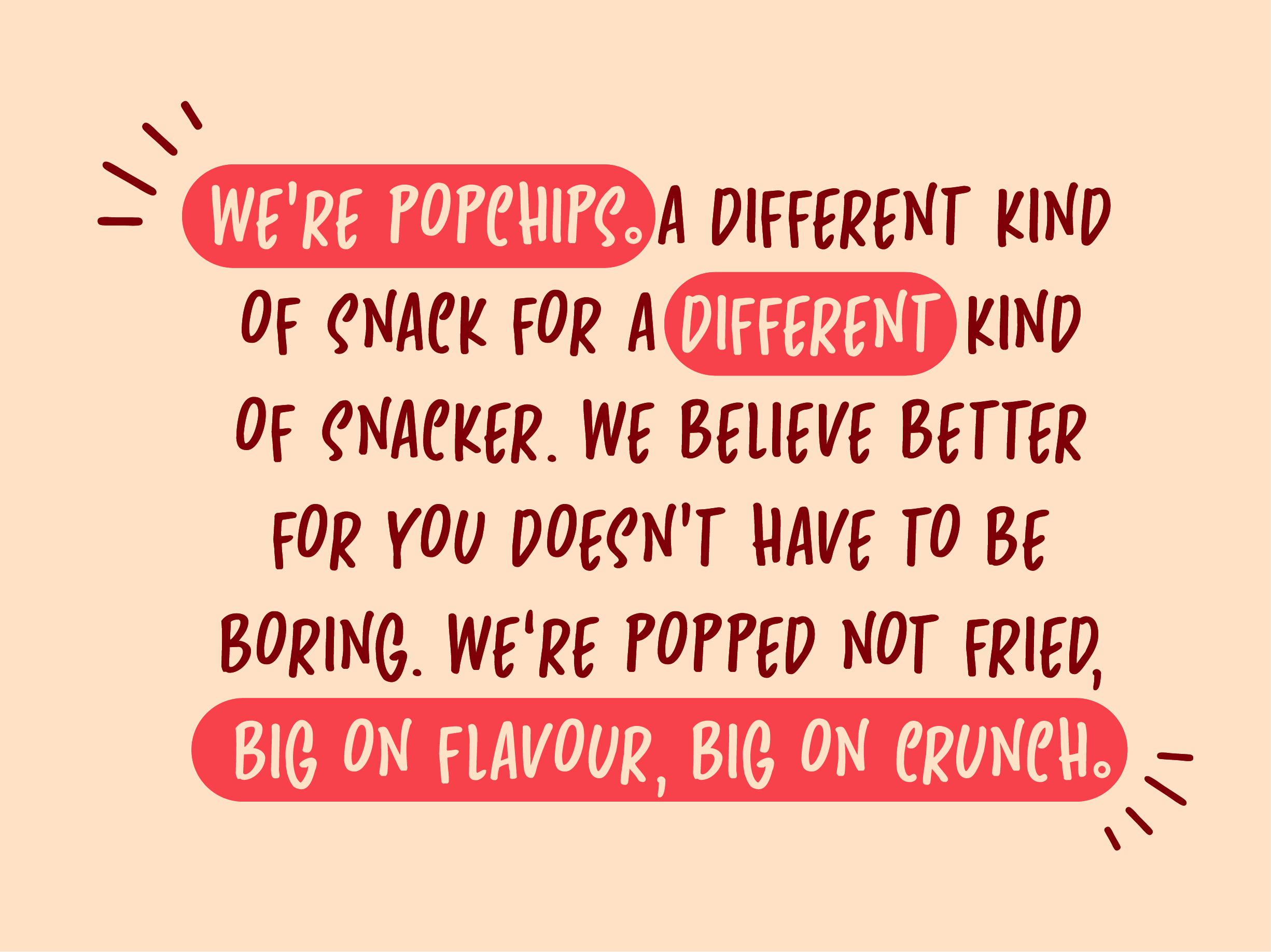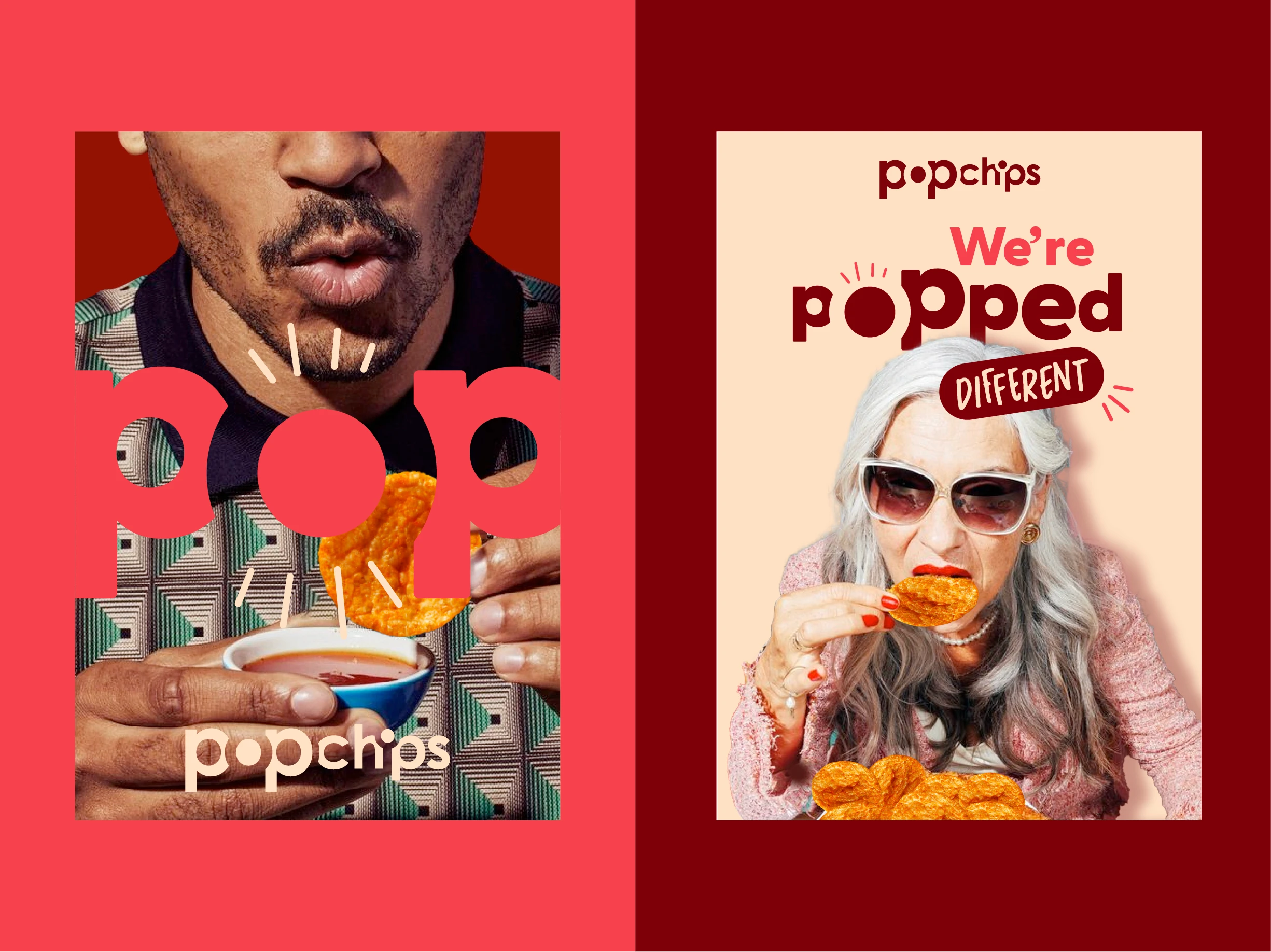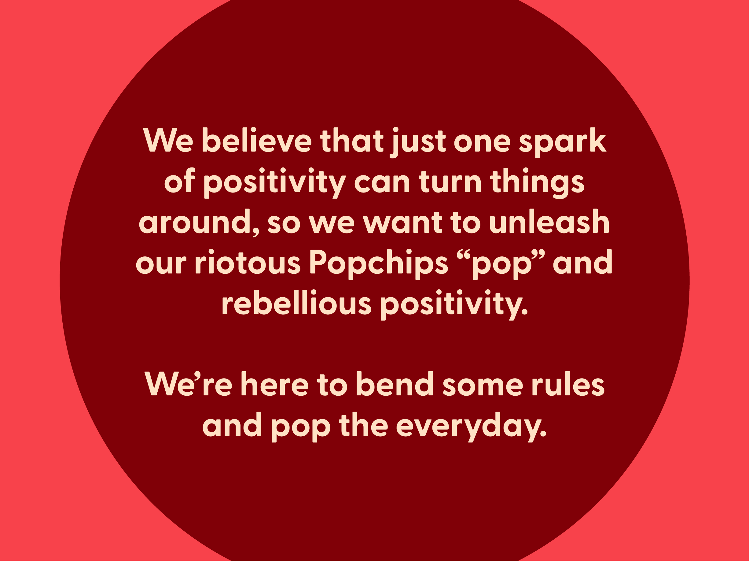 Popchips required a brand refresh to cement their position as the original popped snack in an increasingly crowded market. Popchips wanted to bring a healthy dose of good vibes to shake up the status quo. The identity for Popchips centred around the brand strategy of a snack that pops the everyday with rebellious positivity. With the thought that one spark of positivity can turn things around. The dynamic visual language created was inspired by the ethos of positive rebellion, using a quirky light-hearted photography and illustration style, alongside a playful typography design. The visual identity uses clean bold design elements to let the photography and typography come to the forefront.